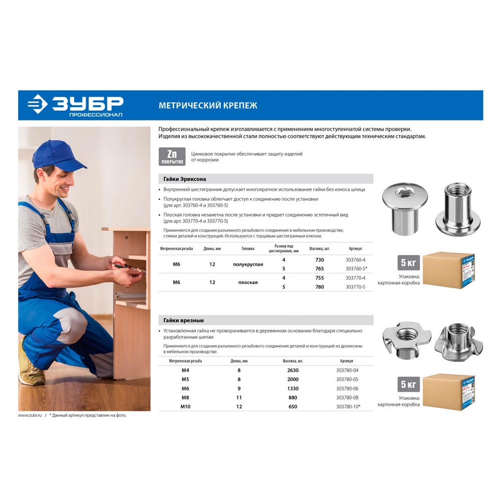 Гайка Эриксона ЗУБР 303770-4, используется в мебельном производстве. Внутренний шестигранник допускает многократное использование гайки без износа шлица. Плоская головка незаметна после установки и придает соединению эстетичный вид. Цинковое покрытие гарантирует защиту от коррозии. Гайки Эриксона изготовлены из высококачественной стали в полном соответствии с действующими стандартами и техническими предписаниями.
