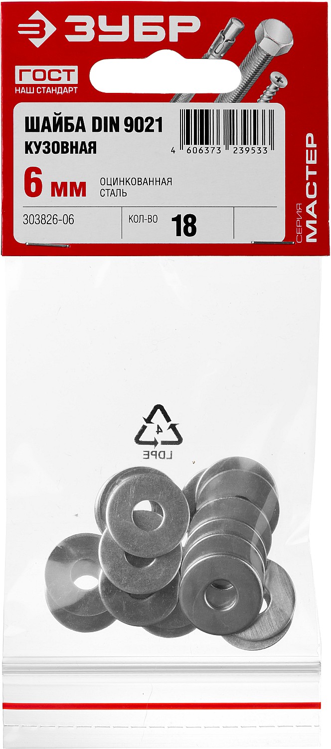 Шайба DIN 9021 кузовная, 6 мм, 18 шт, оцинкованная, ЗУБР