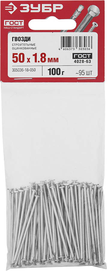 ЗУБР 50 х 1.8 мм, 100 гр., ГОСТ 4028-100, гвозди строительные оцинкованные 305036-18-050