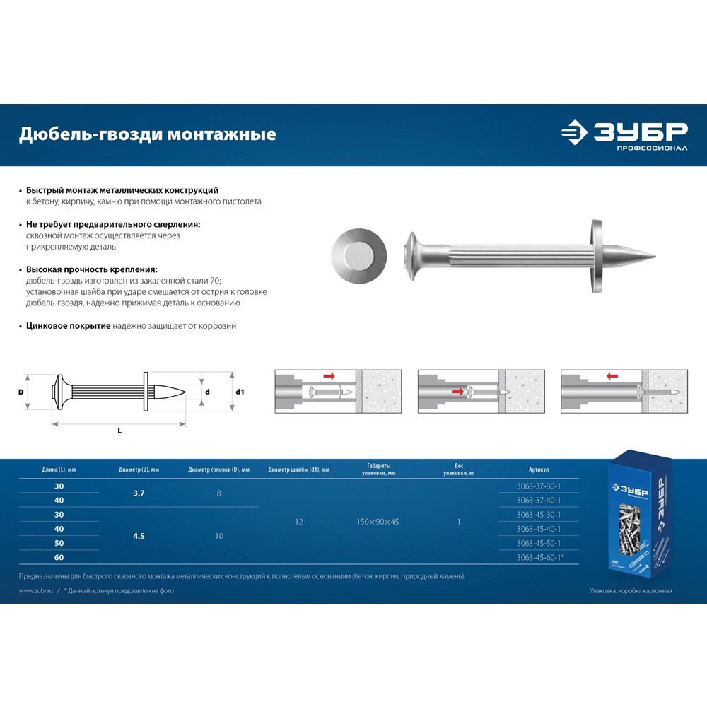 ДГМ дюбель-гвозди монтажные по бетону, пакет 1кг 3063-45-60-1 Зубр