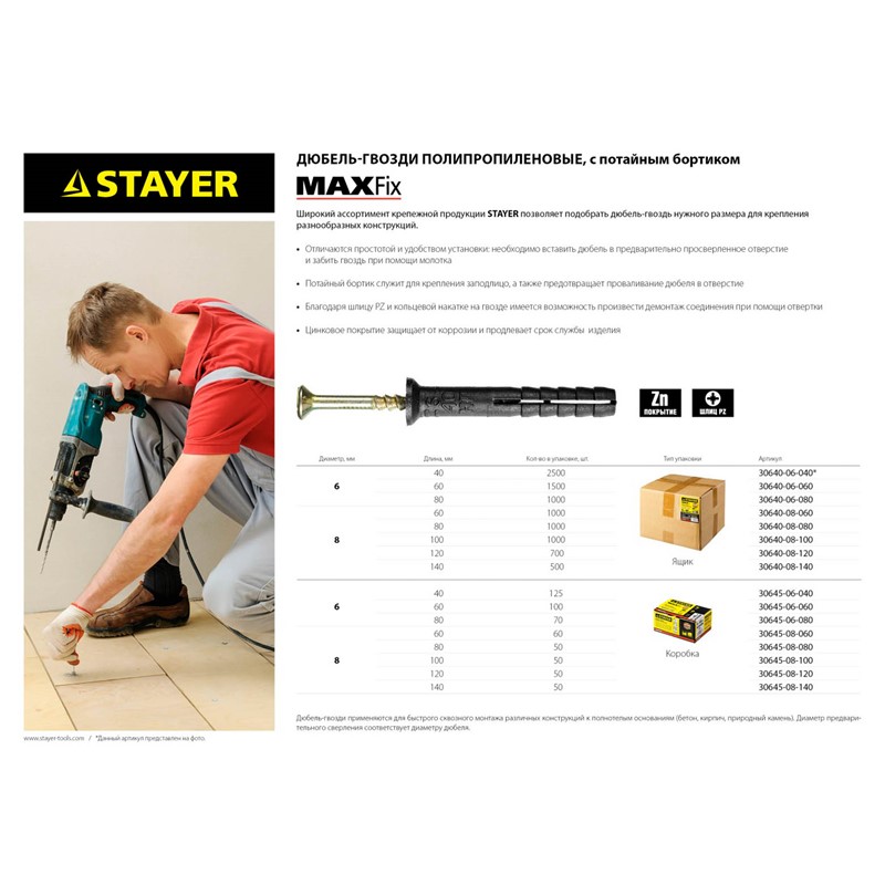 Дюбель-гвоздь STAYER 30640-08-120, предназначен для быстрого сквозного монтажа различных конструкций к полнотелым основаниям (бетон, кирпич, природный камень). Широкий ассортимент крепежной продукции STAYER позволяет подобрать дюбель-гвоздь нужного размера для крепления разнообразных конструкций.