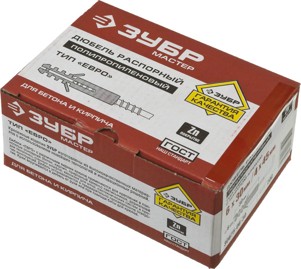 Дюбель распорный полипропиленовый, тип "ЕВРО", в комплекте с шурупом-крюком, 6 х 30 / 4 х 45 мм, 200 шт, ЗУБР