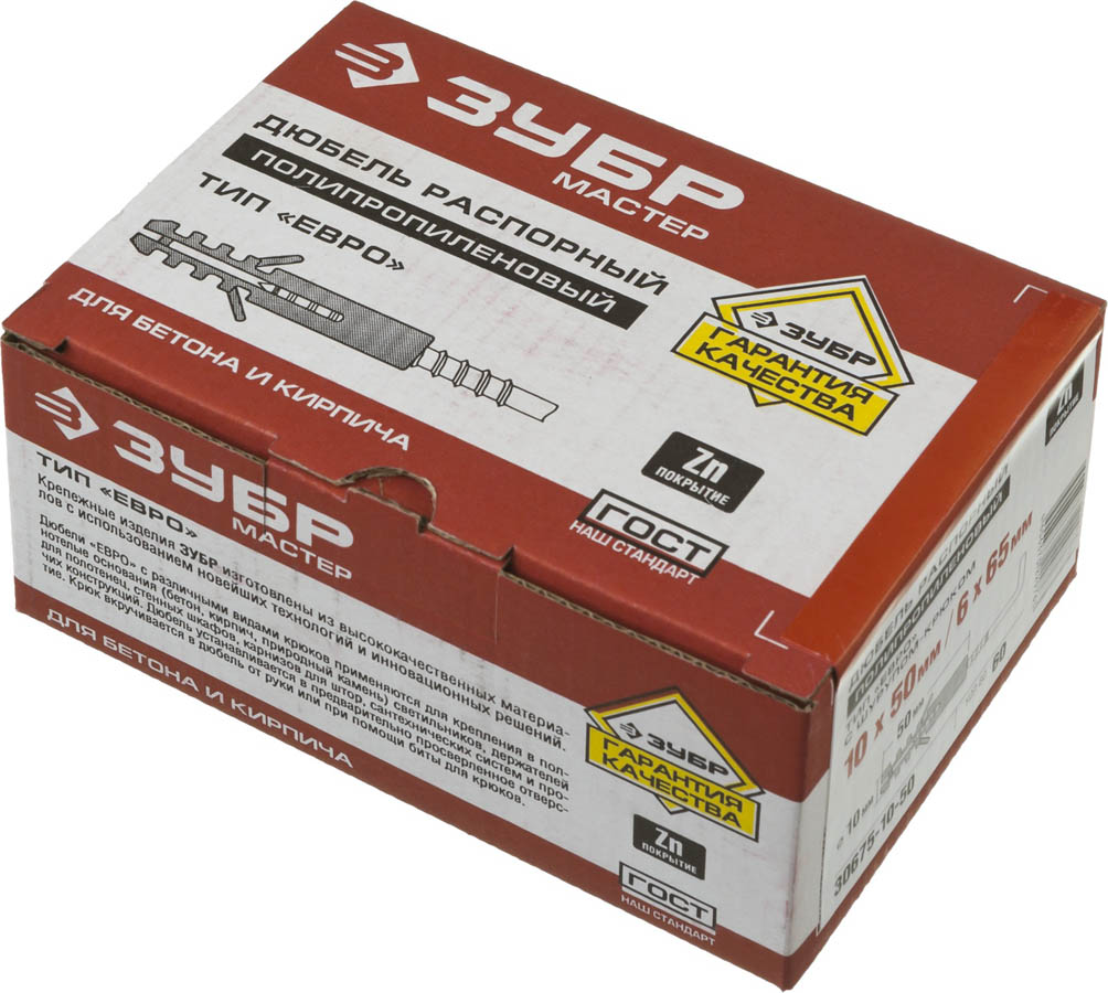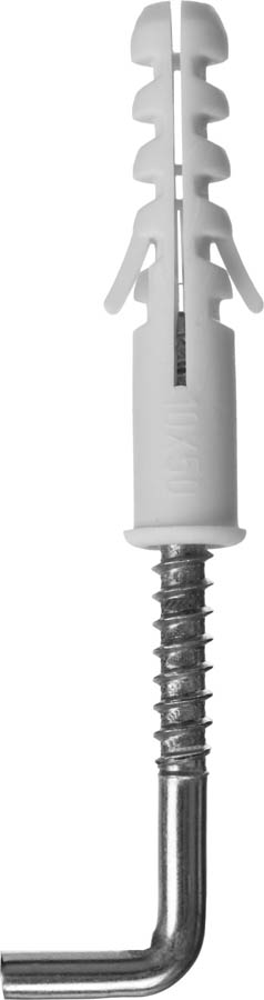 Распорные дюбели "ЕВРО" ЗУБР 30675-10-50, предназначены для крепления в полнотелые основания (бетон, кирпич, природный камень) светильников, держателей для полотенец, стенных шкафов, карнизов для штор, сантехнических систем и прочих конструкций. Дюбель устанавливается в предварительно просверленное отверстие. Диаметр предварительного сверления: 10 мм. Крюк вкручивается в дюбель от руки или при помощи биты для крюков. Дюбели изготовлены из высококачественного полипропилена и используются для крепления различных элементов и конструкций к несущему основанию. Находят широкое применение в строительстве и быту для крепления полок, шкафов, картин, светильников, сантехники и т.п. Дюбель состоит из нераспорной части и распорной (рабочей) зоны, которая изменяет свои размеры (форму) при закреплении. Специально разработанные "усы" предотвращают проворачивание установленного дюбеля в отверстии. Полипропилен устойчив к воздействию влаги, что позволяет использовать дюбели при выполнении наружных работ.