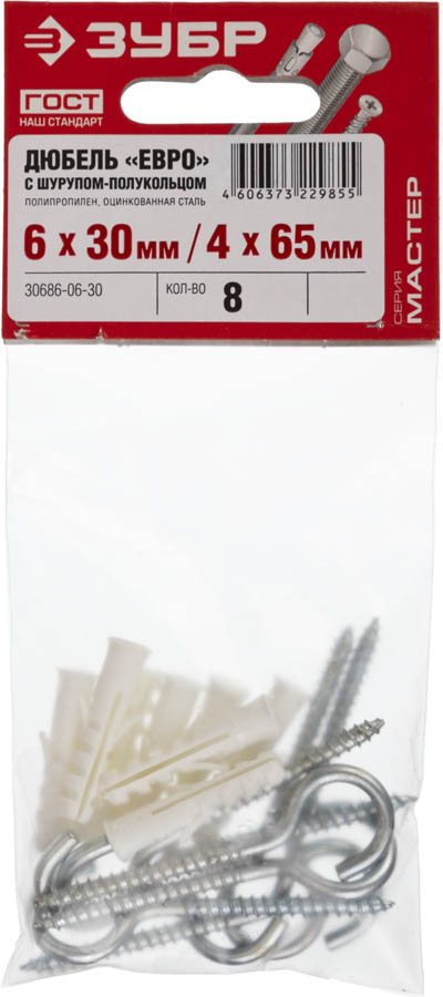 Дюбель распорный полипропиленовый, тип "ЕВРО", в комплекте с шурупом-полукольцом, 6 х 30 / 4 х 65 мм, 8 шт, ЗУБР