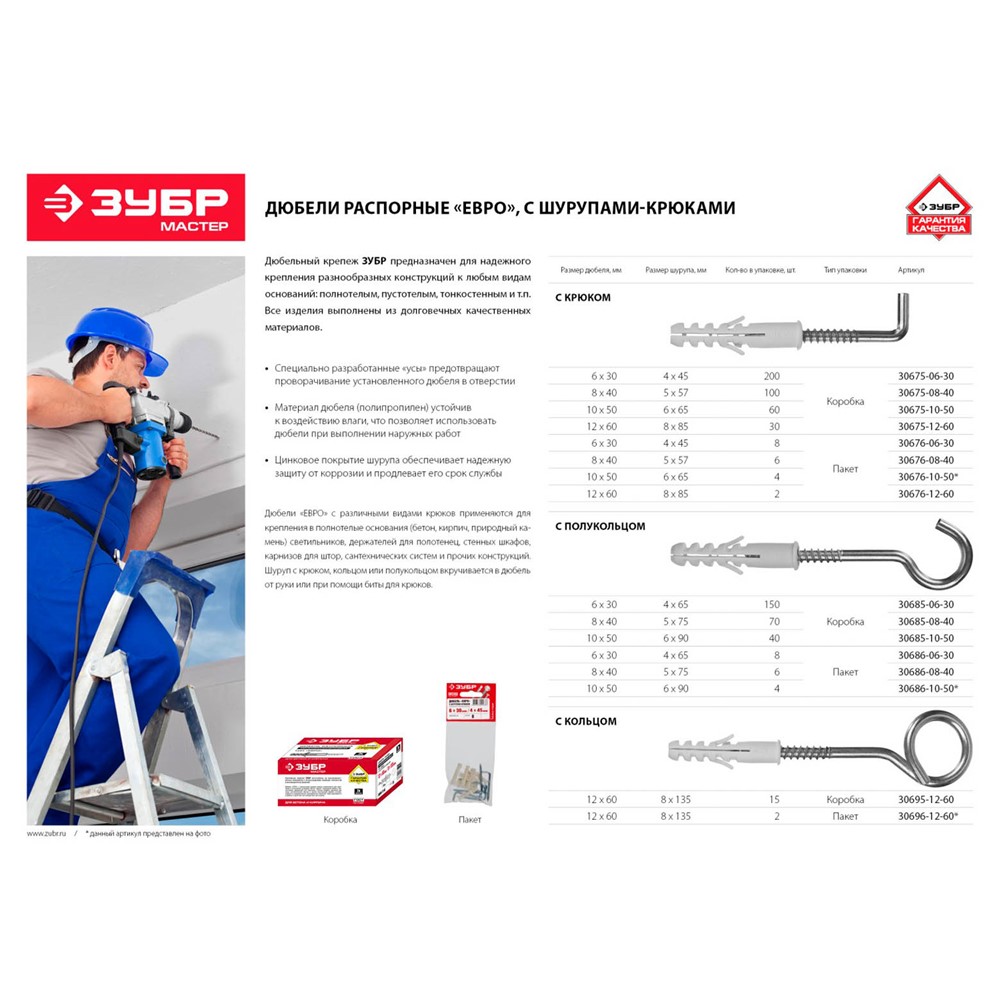 Распорные дюбели "ЕВРО" ЗУБР 30695-12-60, предназначены для крепления в полнотелые основания (бетон, кирпич, природный камень) светильников, держателей для полотенец, стенных шкафов, карнизов для штор, сантехнических систем и прочих конструкций. Дюбель устанавливается в предварительно просверленное отверстие. Диаметр предварительного сверления: 12 мм. Крюк вкручивается в дюбель от руки или при помощи биты для крюков. Дюбели изготовлены из высококачественного полипропилена и используются для крепления различных элементов и конструкций к несущему основанию. Находят широкое применение в строительстве и быту для крепления полок, шкафов, картин, светильников, сантехники и т.п. Дюбель состоит из нераспорной части и распорной (рабочей) зоны, которая изменяет свои размеры (форму) при закреплении. Специально разработанные "усы" предотвращают проворачивание установленного дюбеля в отверстии. Полипропилен устойчив к воздействию влаги, что позволяет использовать дюбели при выполнении наружных работ.