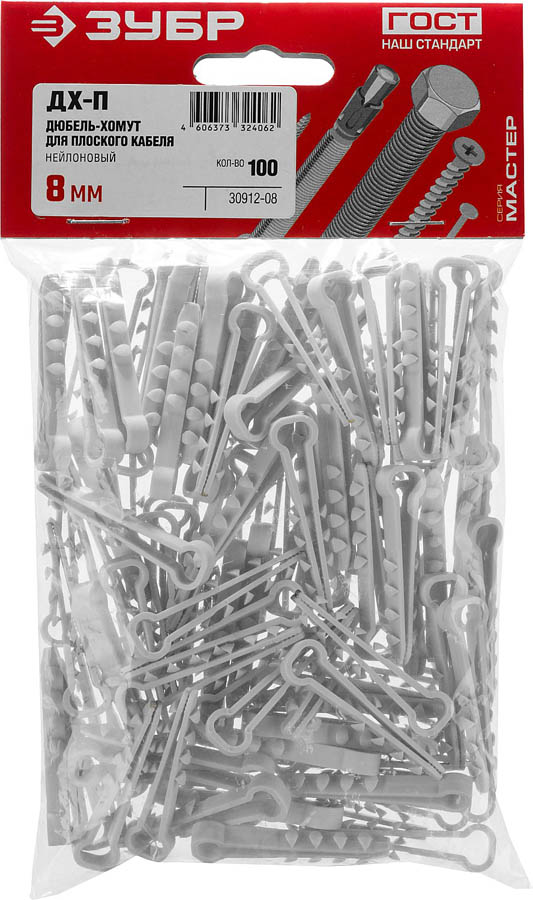Дюбель-хомут для плоского кабеля ДХ-П, 8 мм, 100 шт, нейлоновый, ЗУБР