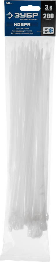 Кабельные стяжки белые КОБРА, с плоским замком, 3.6 х 280 мм, 50 шт, нейлоновые, ЗУБР Профессионал