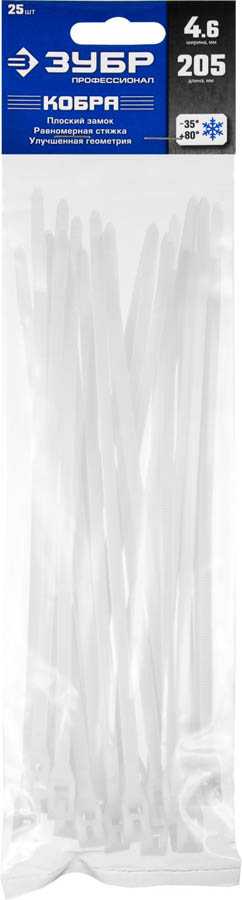 Кабельные стяжки белые КОБРА, с плоским замком, 4.6 х 205 мм, 25 шт, нейлоновые, ЗУБР Профессионал
