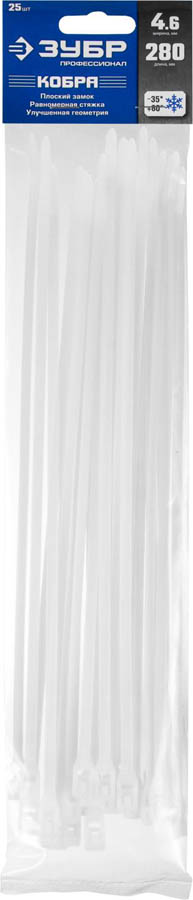 Кабельные стяжки белые КОБРА, с плоским замком, 4.6 х 280 мм, 25 шт, нейлоновые, ЗУБР Профессионал