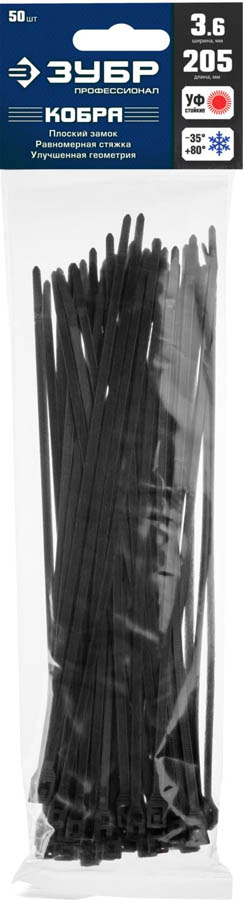 Кабельные стяжки черные КОБРА, с плоским замком, 3.6 х 205 мм, 50 шт, нейлоновые, ЗУБР Профессионал