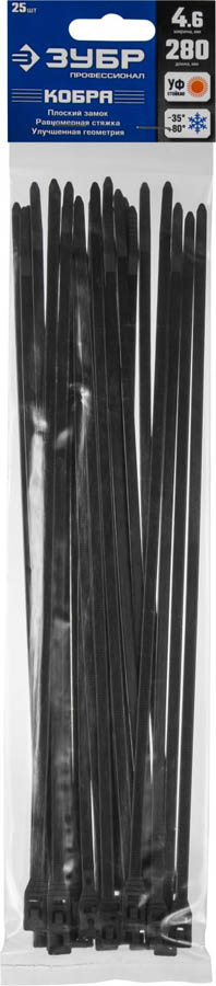 Кабельные стяжки черные КОБРА, с плоским замком, 4.6 х 280 мм, 25 шт, нейлоновые, ЗУБР Профессионал