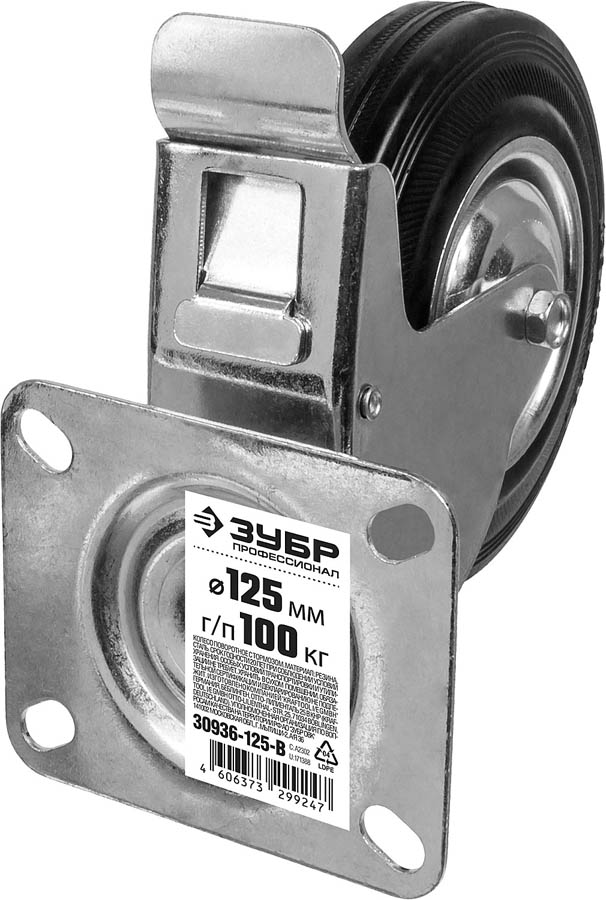 Колесо поворотное c тормозом d=125 мм, г/п 100 кг, резина/металл, игольчатый подшипник, ЗУБР Профессионал