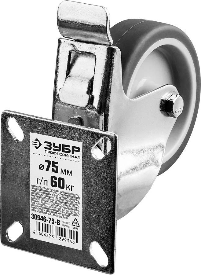Колесо поворотное c тормозом ЗУБР 30946-75-B применяются для перемещения тележек и легковесного оборудования. Рекомендуется для полов с неровностями и препятствиями, а также для использования внутри помещений и на улице. Колесные опоры обеспечивают удобное перемещение тележек и контейнеров легкой и стандартной грузоподъемности, легковесного оборудования, строительных лесов и прочих конструкций. Благодаря износостойким материалам колесные опоры находят применение как в помещениях, так и вне их. Крепежная платформа свободно вращается благодаря шариковому подшипнику. Могут использоваться в условиях повышенной влажности и слабых кислот. Стальной штампованный диск обеспечивает повышенную прочность. Игольчатый подшипник обеспечивает легкость вращения колеса. Специальная прокладка предотвращает попадание пыли в полость шарикового подшипника на опоре. Наличие педали тормоза обеспечивает возможность блокировки колеса в любом положении. Цинковое покрытие надежно защищает изделие от коррозии.