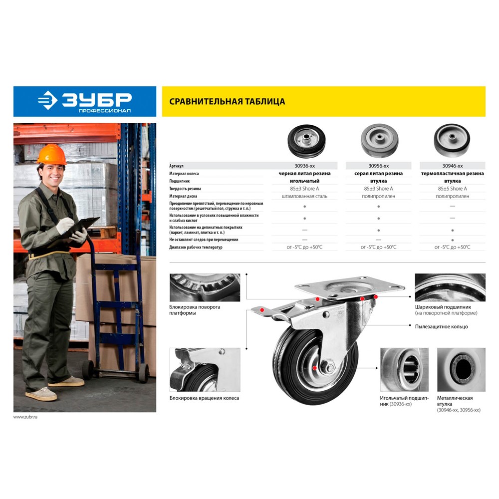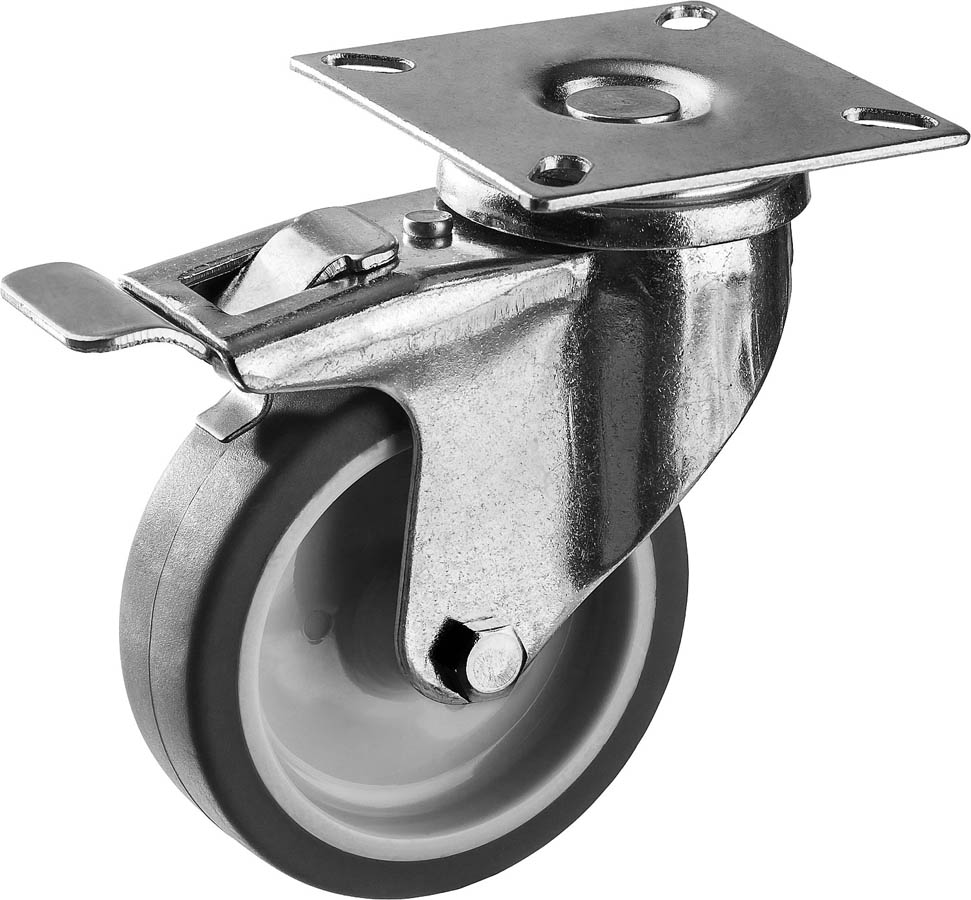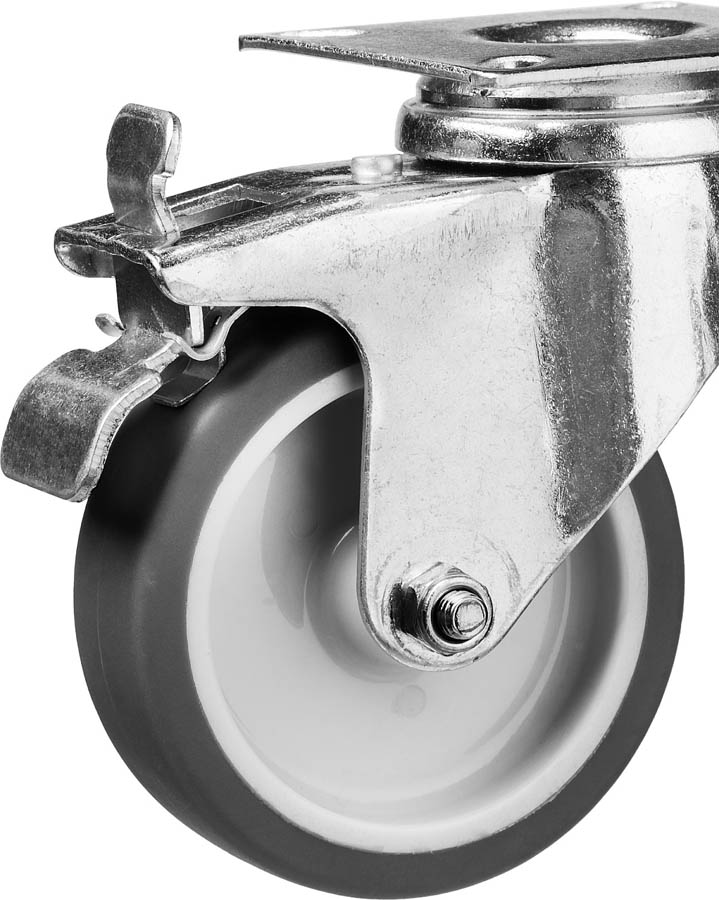 Колесо поворотное с тормозом d=75 мм, г/п 60 кг, термопластич. резина/полипропилен, ЗУБР Профессионал