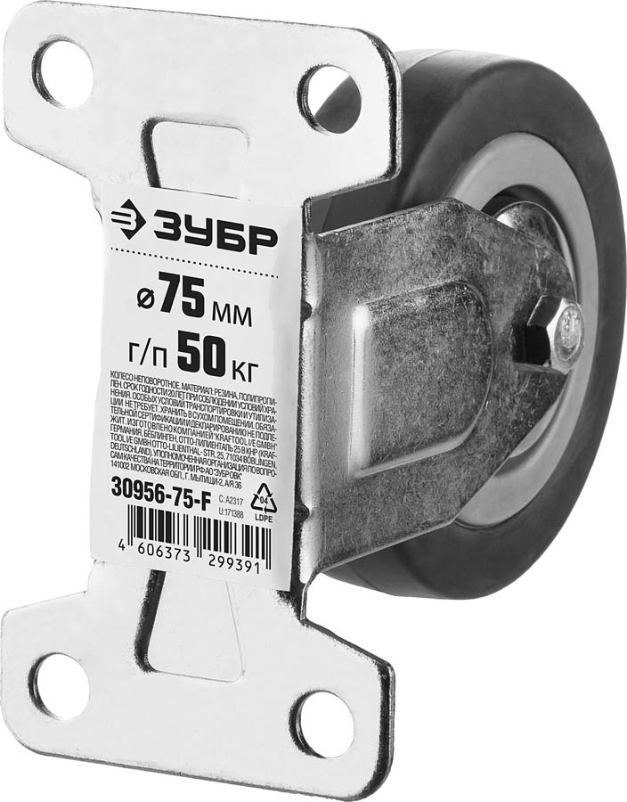 Колесо неповоротное ЗУБР 30956-75-F применяются для перемещения тележек и легковесного оборудования. Рекомендуется для полов с неровностями и препятствиями, а также для использования внутри помещений и на улице. Колесные опоры обеспечивают удобное перемещение тележек и контейнеров легкой и стандартной грузоподъемности, легковесного оборудования, строительных лесов и прочих конструкций. Благодаря износостойким материалам колесные опоры находят применение как в помещениях, так и вне их, легко преодолевают различные препятствия, не повреждают напольные покрытия. Могут использоваться в условиях повышенной влажности и слабых кислот. Не повреждают хрупкие напольные покрытия. Стальной штампованный диск обеспечивает повышенную прочность. Игольчатый подшипник обеспечивает легкость вращения колеса. Фиксированное положение крепежной платформы. Широкий диапазон рабочих температур. Цинковое покрытие надежно защищает изделие от коррозии.