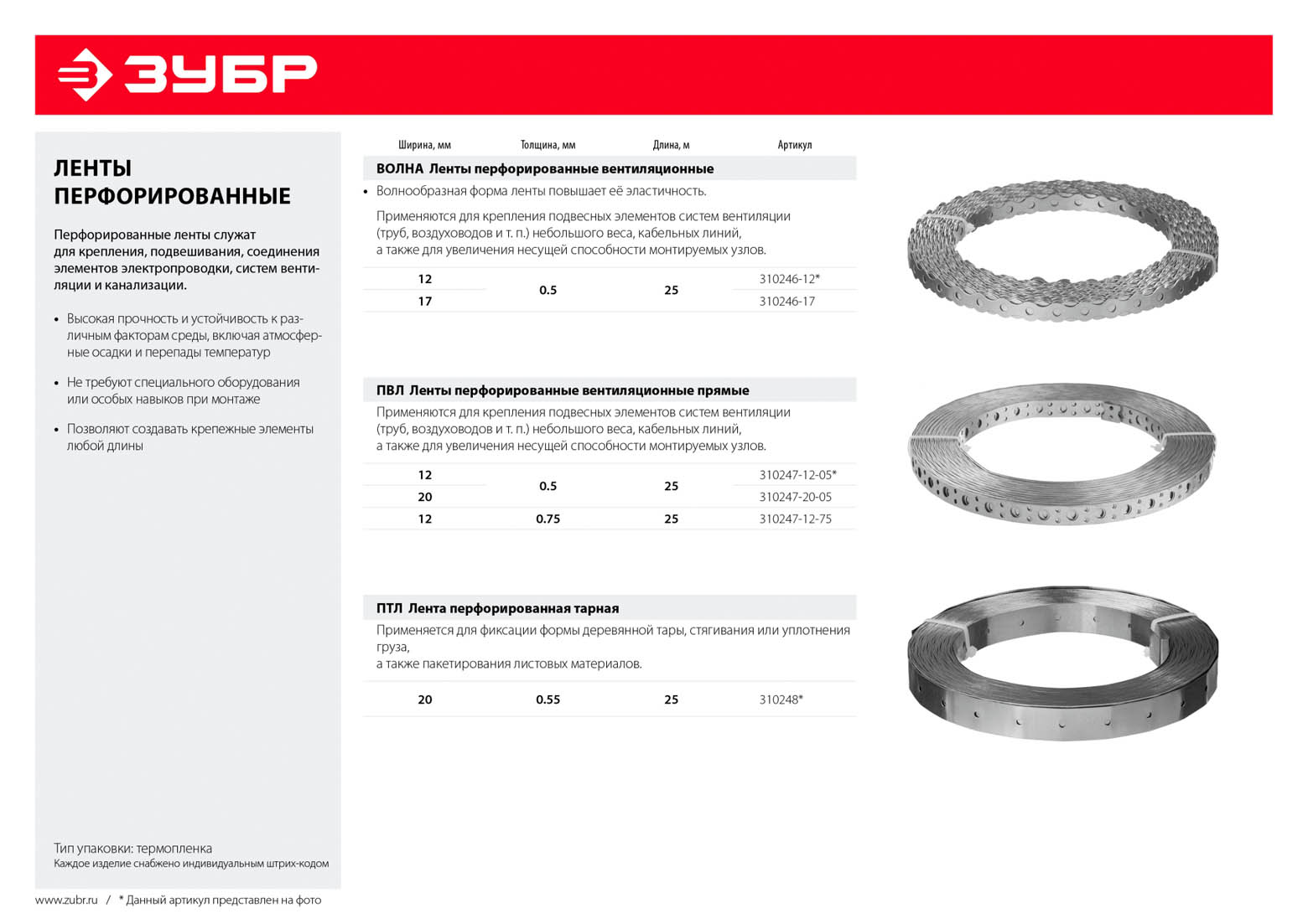 Перфорированная вентиляционная лента прямая ЗУБР 310247-12-05, применяется для создания дополнительной жесткости и увеличения несущей способности различных элементов конструкций. Перфорированная лента позволяет создавать крепежные элементы любой длины. Лента крепится к деревянному основанию специальными гвоздями с конической головкой или саморезами. Наличие большого количества отверстий позволяет легко и быстро осуществить крепление в заданном месте. Лента обладает высокой прочностью и устойчивостью к различным факторам среды, включая атмосферные осадки и перепады температур. Не требует специального оборудования или особых навыков при монтаже. Изготовлена из высококачественной листовой стали. Цинковое покрытие надежно защищает от коррозии.
