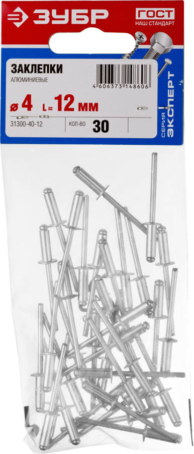 Заклепки алюминиевые, 4,0х12 мм, 30 шт, ЗУБР Профессионал