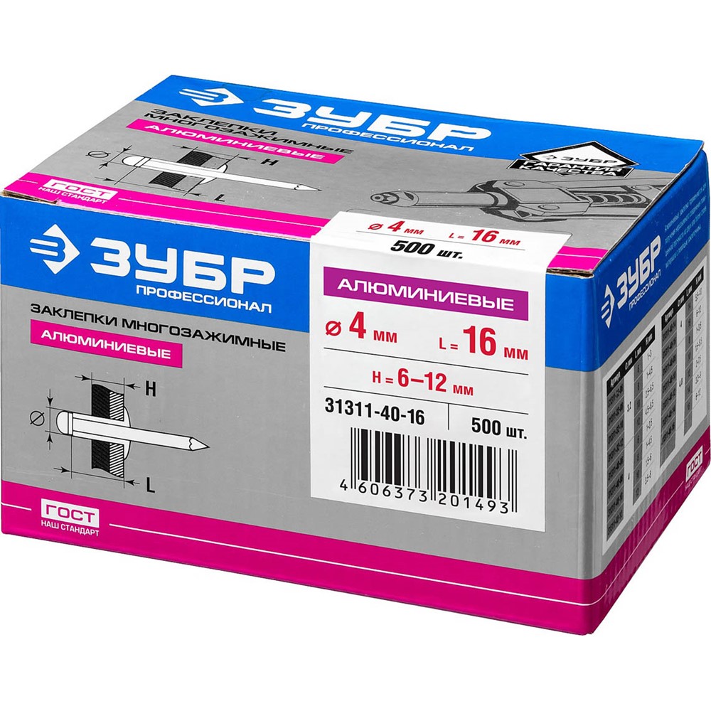 ЗУБР 4,0 x 16 мм, 500 шт., заклепки многозажимные, алюминиевые 31311-40-16 Профессионал