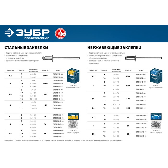Заклепки стальные, коробка, серия ПРОФЕССИОНАЛ 31312-32-06 Зубр