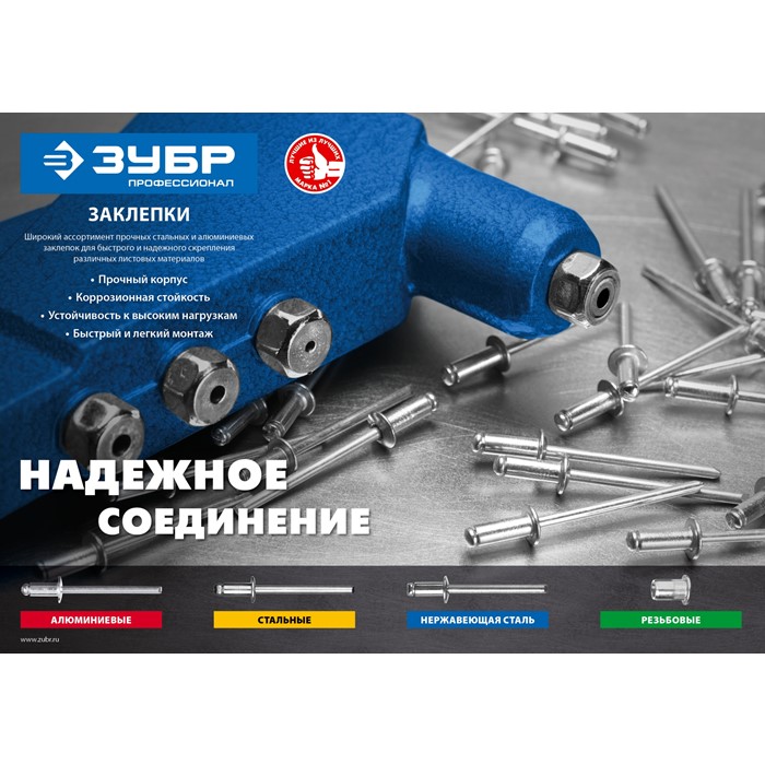 - Корпус заклепки изготовлен из оцинкованной стали, стойкой к коррозии,