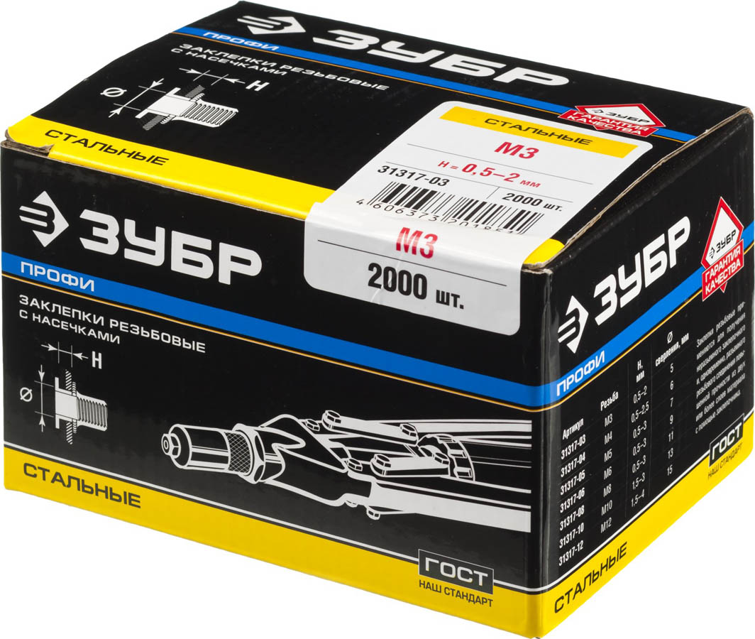 Резьбовые заклепки с насечками, М3, 2000 шт, стальные, стандартный бортик, ЗУБР Профессионал