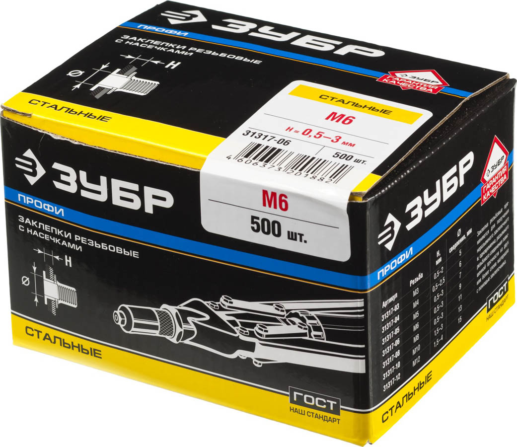 Резьбовые заклепки с насечками, М6, 500 шт, стальные, стандартный бортик, ЗУБР Профессионал