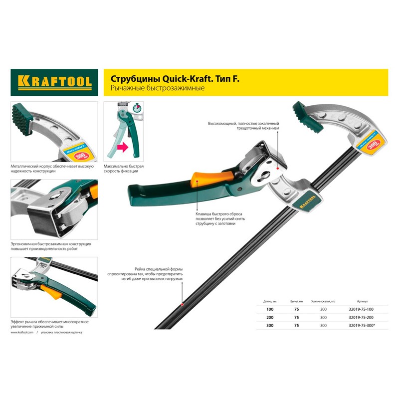Струбцина KRAFTOOL, рычажная, быстрозажимная, тип "F", 75х300 мм