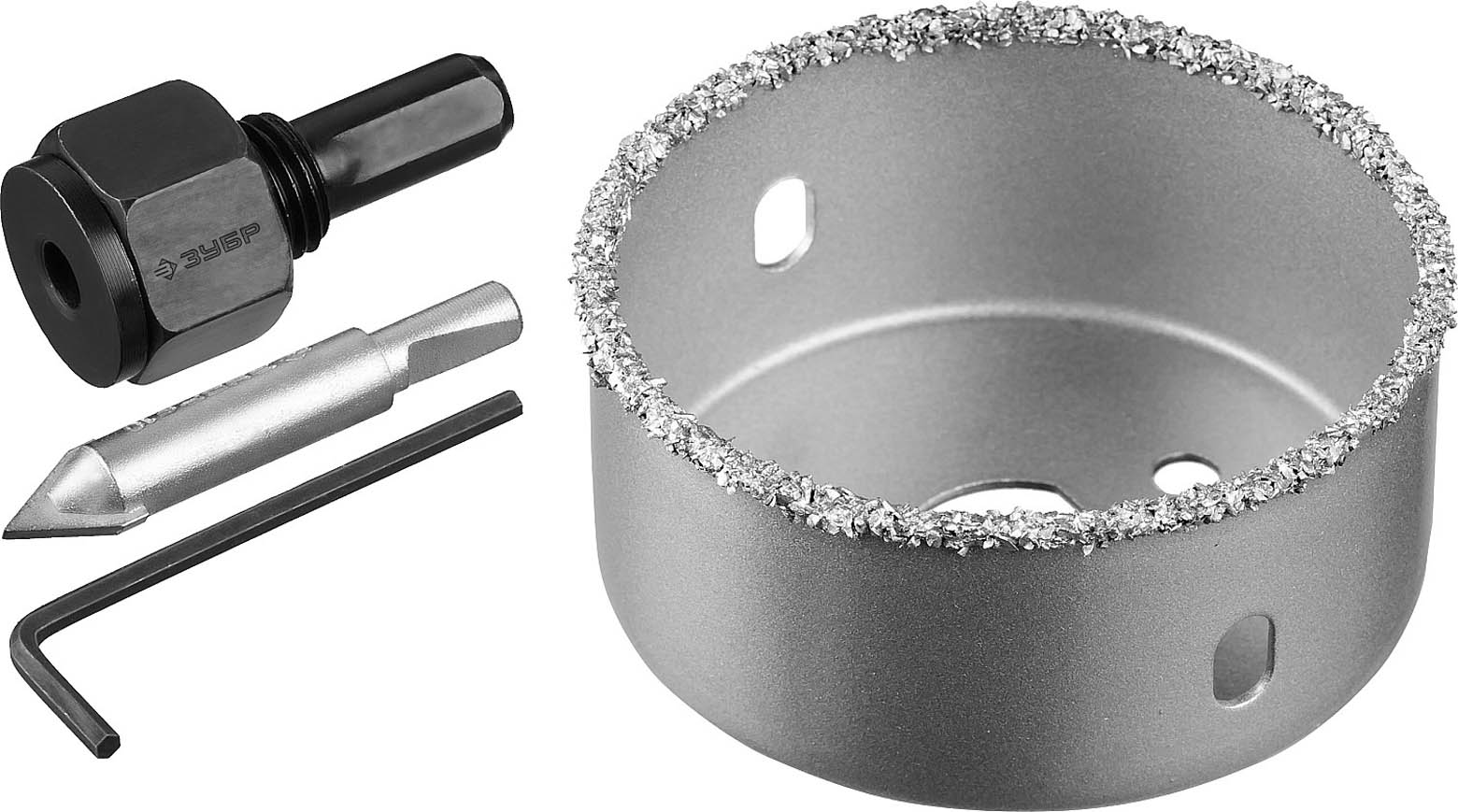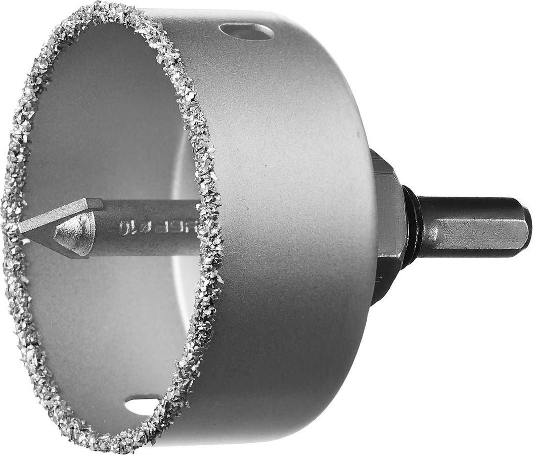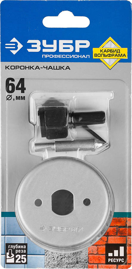 Коронка-чашка ЗУБР "ПРОФЕССИОНАЛ" c карбид-вольфрамовым нанесением, 64 мм, высота 25 мм, в сборе с державкой и сверлом