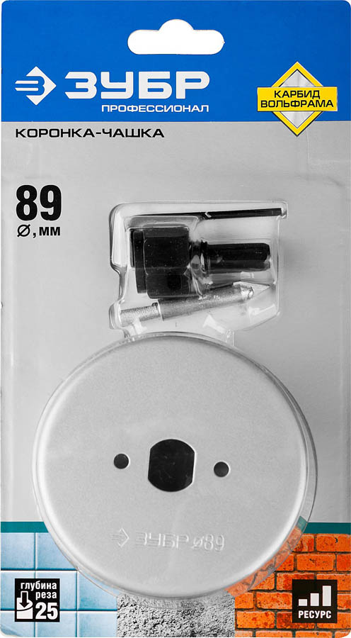 Коронка-чашка ЗУБР "ПРОФЕССИОНАЛ" c карбид-вольфрамовым нанесением, 89 мм, высота 25 мм, в сборе с державкой и сверлом