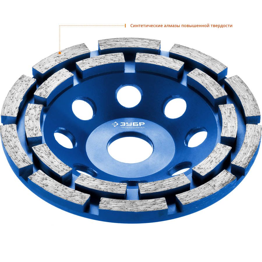 Алмазная чашка ЗУБР 33372-125, используется на УШМ для шлифования бетонных материалов, гранита, природного и искусственного камня. Не требует принудительного водяного охлаждения. Имеет отверстия для естественного охлаждения чашки в процессе шлифования. Корпус алмазной чашки изготовлен из высокопрочной стали. Высота алмазных сегментов 6 мм обеспечивает продолжительный рабочий ресурс шлифовальной чашки (до 600 квадратных метров площади). Два ряда алмазных сегментов для равномерного шлифования и большого объема работ. Фрезерованное основание чашки не допускает биения и дисбаланса в процессе работы. Каждое изделие проходит строгий контроль качества, особое внимание уделяется сбалансированности, т.к. инструмент работает на больших оборотах.