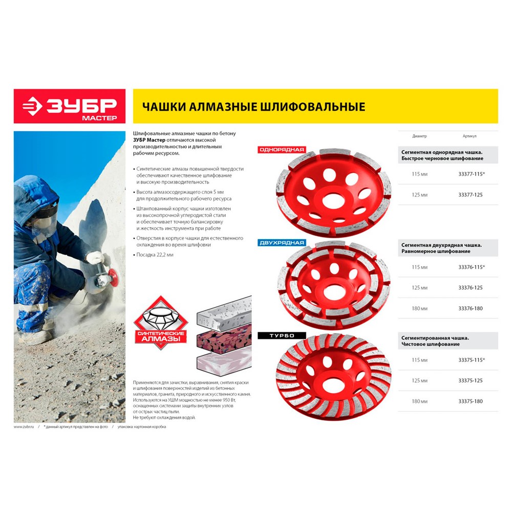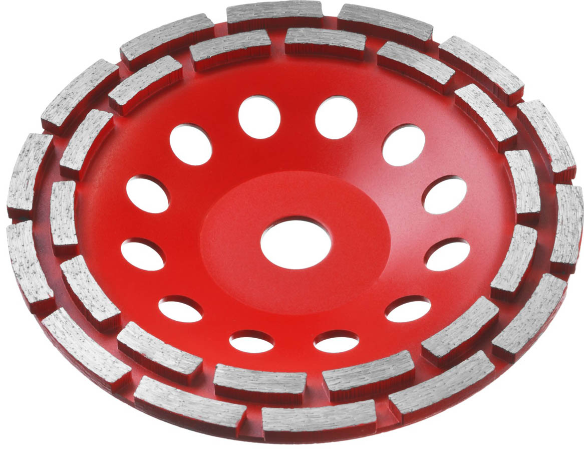 Алмазная чашка ЗУБР 33376-180, используется на УШМ для шлифования бетонных материалов, гранита, природного и искусственного камня. Не требует принудительного водяного охлаждения. Имеет отверстия для естественного охлаждения чашки в процессе шлифования. Корпус алмазной чашки изготовлен из высокопрочной стали. Высота алмазных сегментов 5 мм обеспечивает продолжительный рабочий ресурс шлифовальной чашки (до 700 квадратных метров площади). Два ряда алмазных сегментов для равномерного шлифования и большого объема работ. Фрезерованное основание чашки не допускает биения и дисбаланса в процессе работы. Каждое изделие проходит строгий контроль качества, особое внимание уделяется сбалансированности, т.к. инструмент работает на больших оборотах.
