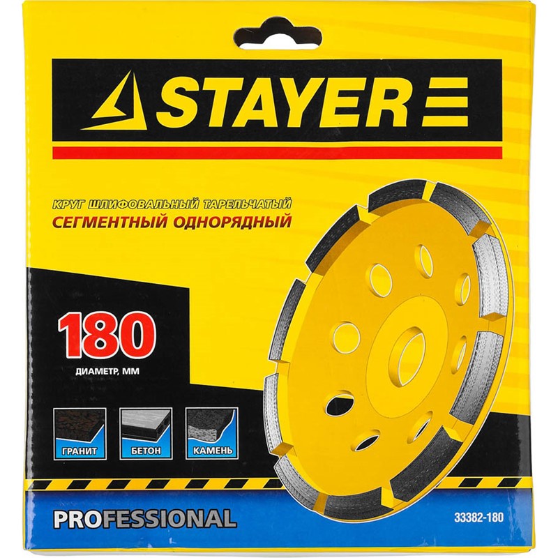 Алмазная чашка STAYER 33382-180, применяется на УШМ для шлифования поверхностей изделий из бетонных материалов, гранита, природного и искусственного камня. Однорядная сегментная рабочая поверхность алмазоносного слоя. Штампованное основание. Отверстия для естественного охлаждения чашки во время шлифовки.