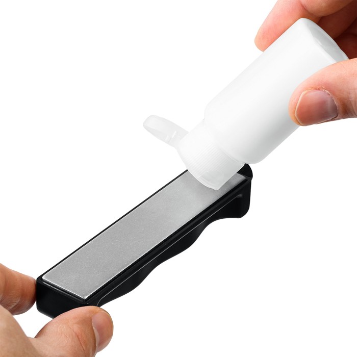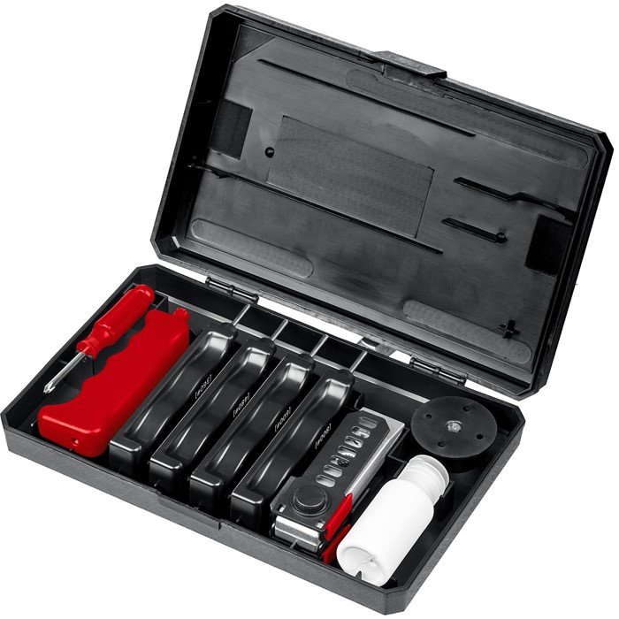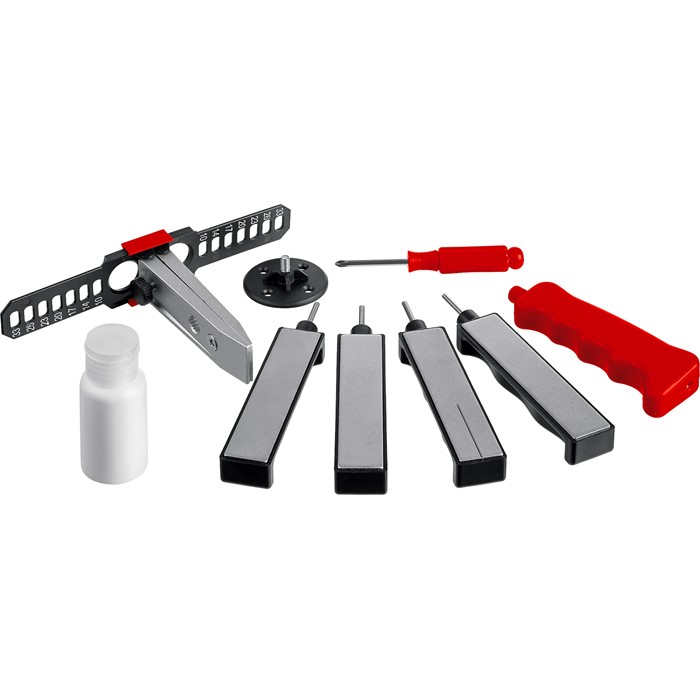| Комплектация | 13 предм.: 4 алмазных бруска, направляющие, струбцина, рукоять, опора, отвертка, масло. |
