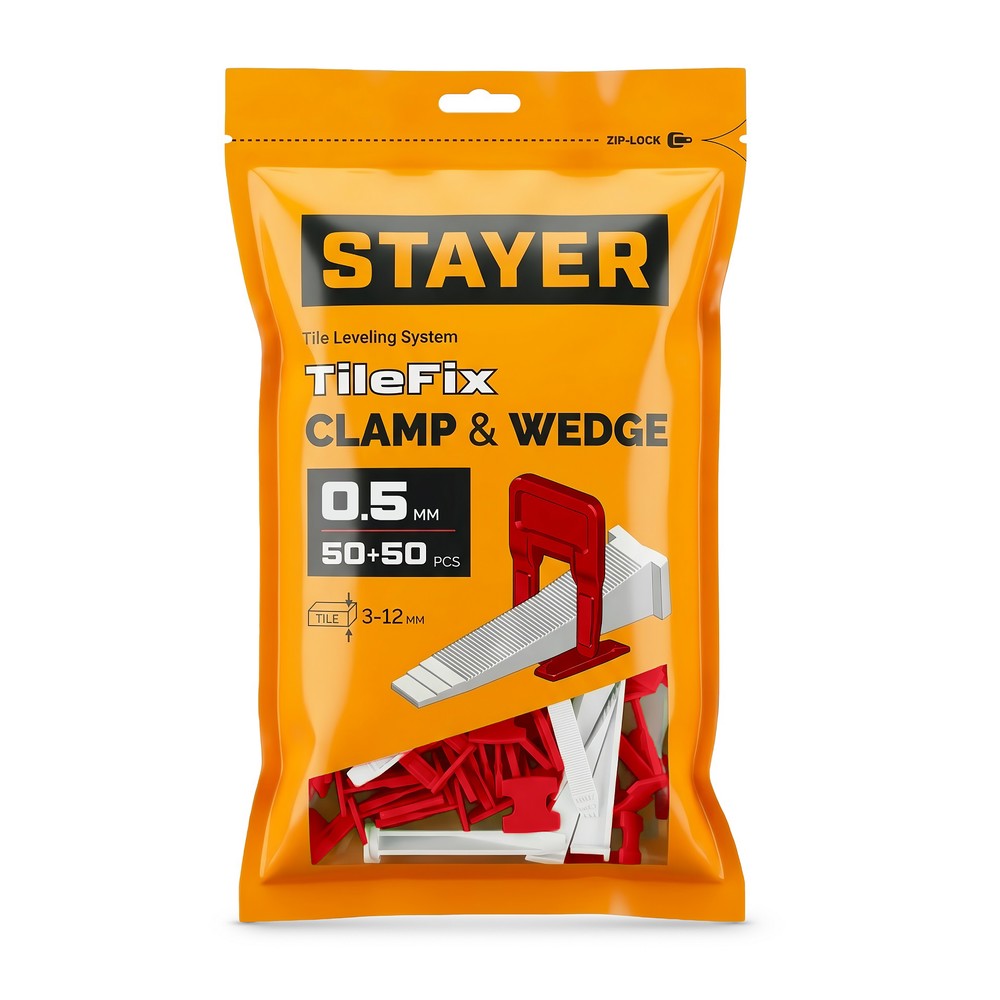 STAYER СВП TileFix, комплект: 0,5 мм, зажим + клин, 50 + 50 шт, система выравнивания плитки ″ворота″ (33840-H50)