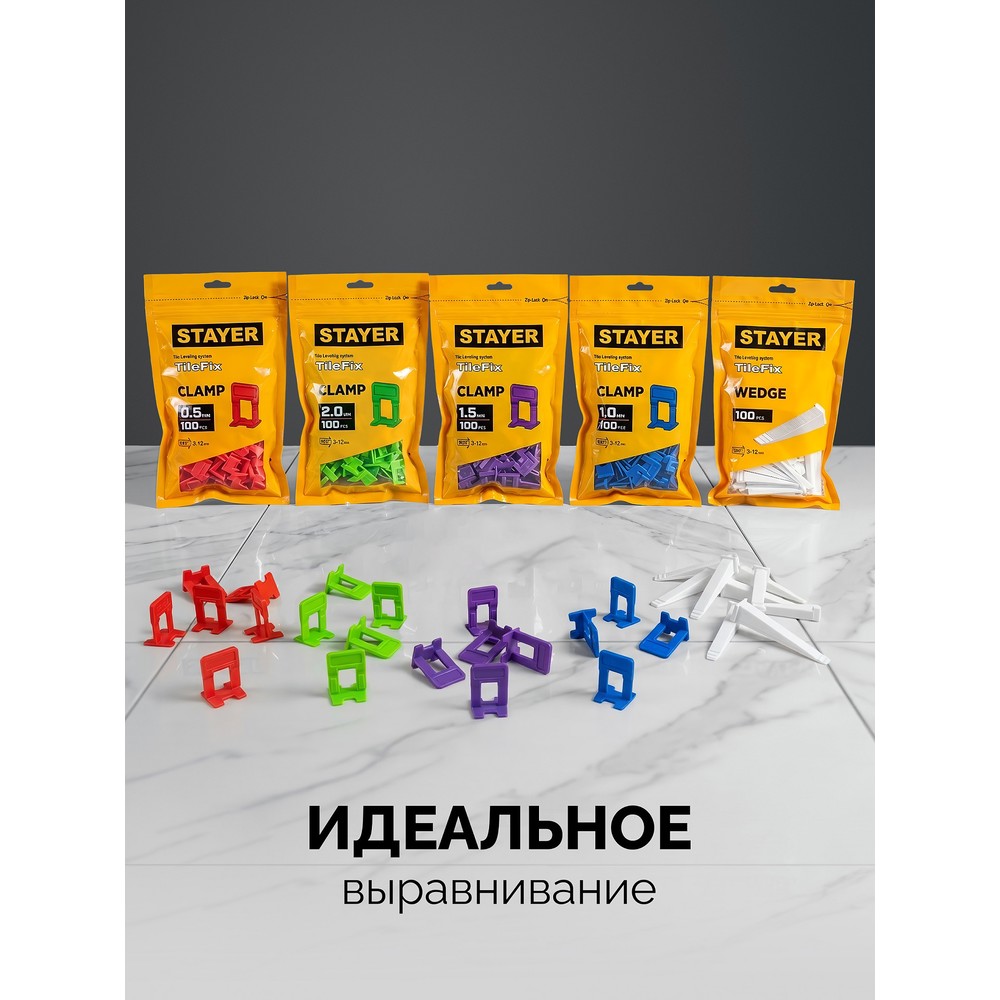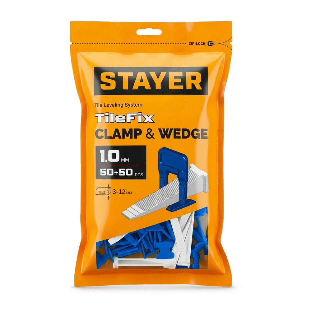 STAYER СВП TileFix, комплект: 1,0 мм, зажим + клин, 50 + 50 шт, система выравнивания плитки ″ворота″ (33841-H50)
