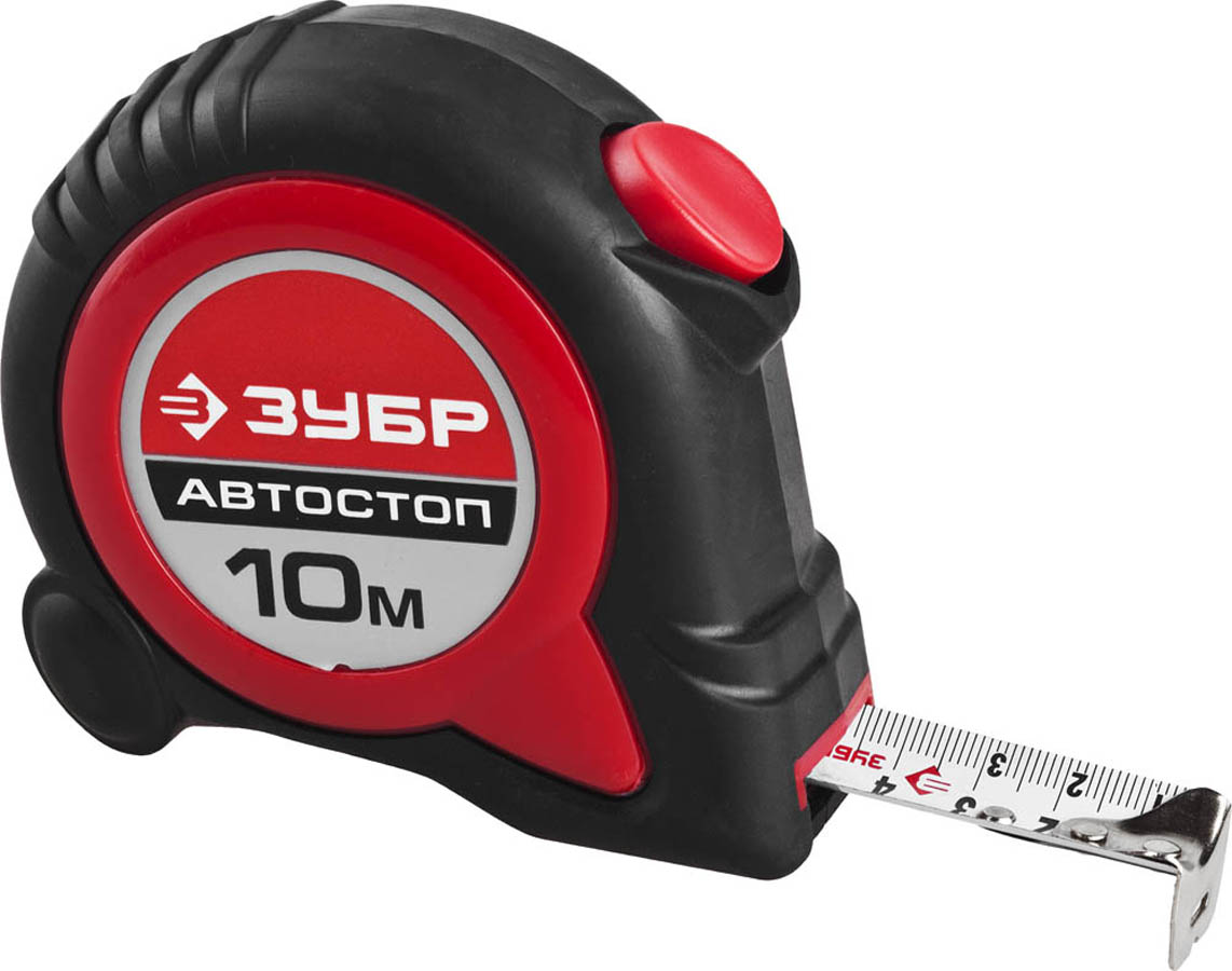 ЗУБР АВТОСТОП 10м / 25мм рулетка с автостопом и ударостойким обрезиненным корпусом