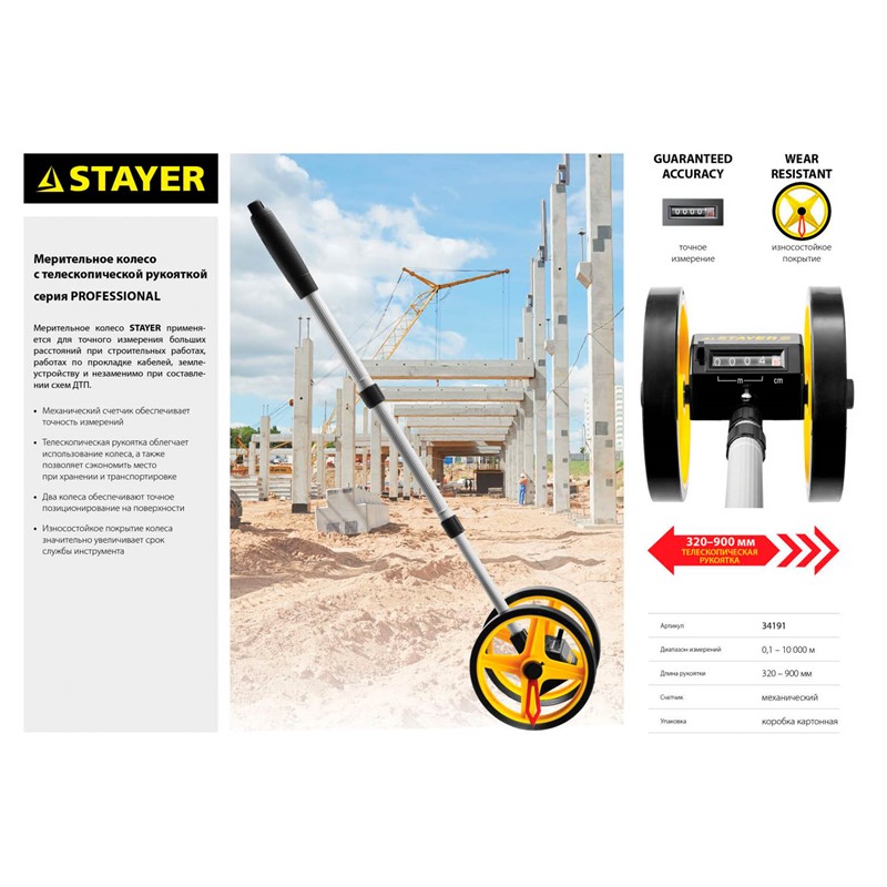 Мерительное колесо STAYER 34191, предназначено для измерения больших расстояний при строительных работах, работах по прокладке кабелей, работах по землеустройству и незаменимо при составлении схем ДТП. Телескопическая рукоятка облегчает использование колеса, а также позволяет сэкономить место при хранении и транспортировке. Два колеса обеспечивают точное позиционирование на поверхности.