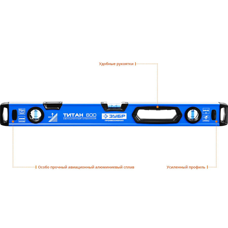 Уровень строительный ЗУБР 34587-060_z01, предназначен для контроля горизонтальности и вертикальности поверхностей. Изготовлены в соответствии с требованиями. Вертикальный глазок с окном на фронтальной плоскости для устранения ошибки углового зрения, увеличения скорости и удобства проведения измерений. Две дополнительные насечки на ампулах показывают уклон в 2°. Заглушки из ударопрочного пластика. Две ручки для удобства работы. Точность 0,5 мм/м.