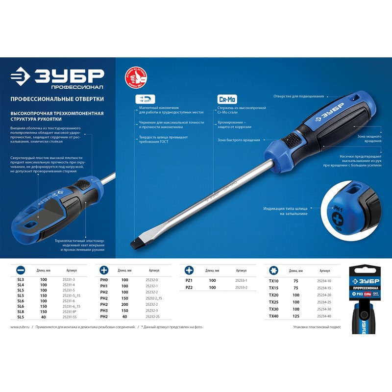 Отвертка выдерживает высокие нагрузки, благодаря высокой твердости наконечника и специальной закалке. Комфортная рукоятка обеспечивает твердый хват и удобство работы.