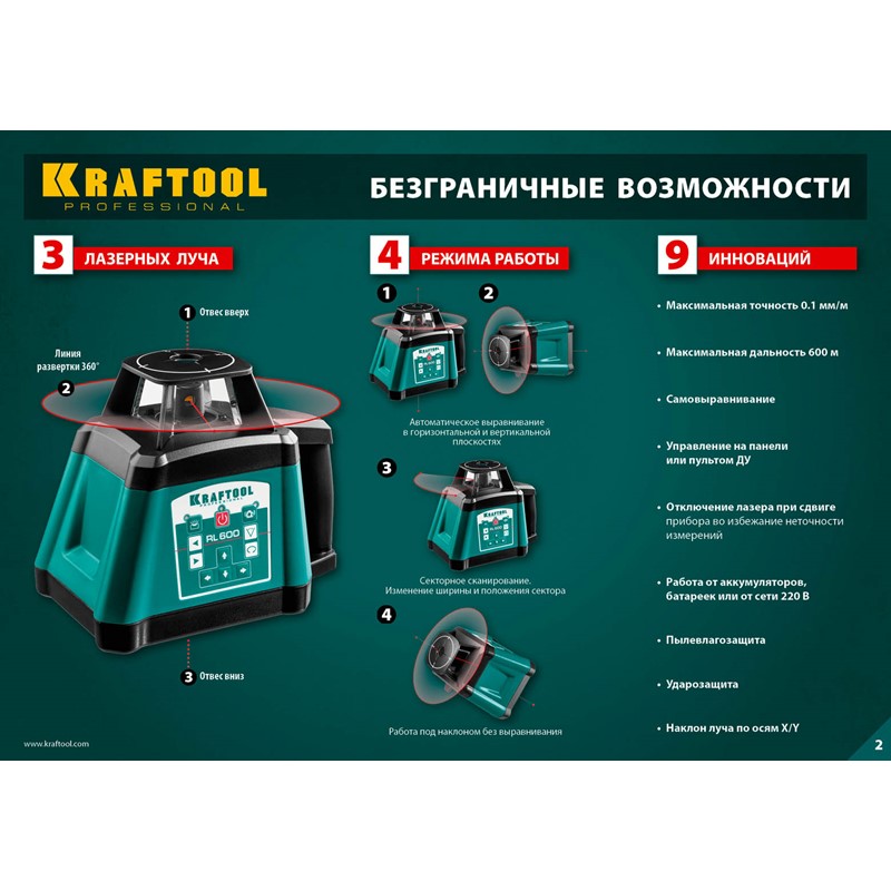 Ротационный лазерный нивелир "RL600", сверхъяркий, KRAFTOOL 34600, 600м, IP54, точн. 0,2 мм/м, 4ХC