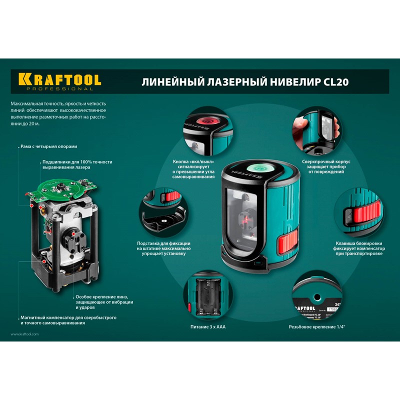 KRAFTOOL CL 20 #5 нивелир лазерный, 20 м, IP54,, точн. +/-0,2 мм/м, держатель, в кейcе
