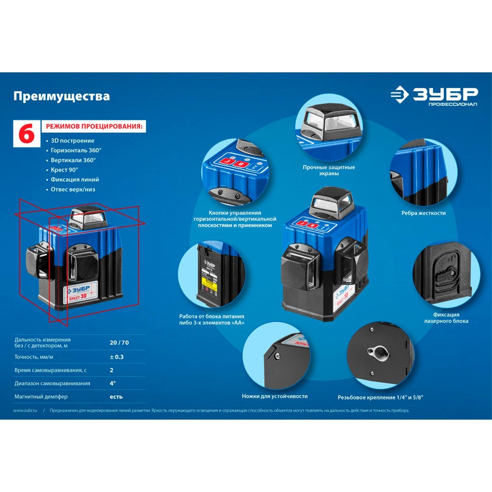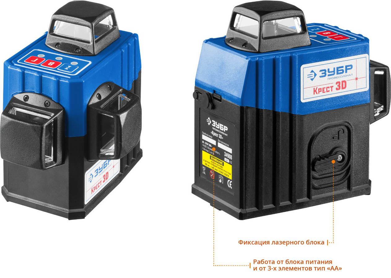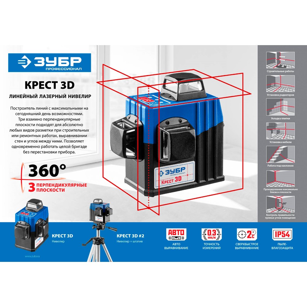 ЗУБР КРЕСТ 3D нивелир лазерный 3х360°, 20м/70м, точн. +/-0,3 мм/м