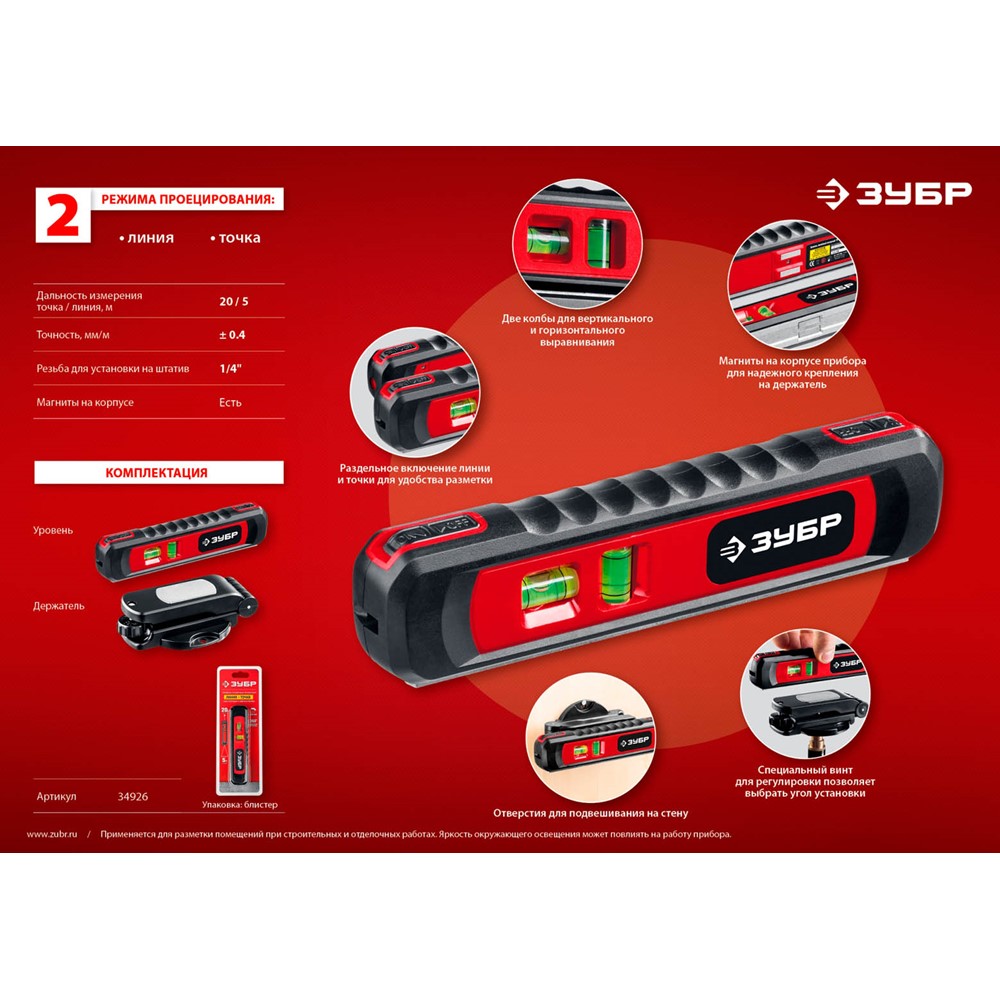 Уровень лазерный ЗУБР 34926, предназначен для проведения разметочных работ. Прибор позволяет выполнять разметку одному человеку, что значительно повышает производительность труда. Два режима проецирования: линия, точка. Раздельное включение линии и точки для удобства разметки. Две колбы для вертикального и горизонтального выравнивания. Магниты на корпусе прибора для надежного крепления на держатель. Специальный винт для регулировки позволяет выбрать угол установки. Возможность установки на штатив.