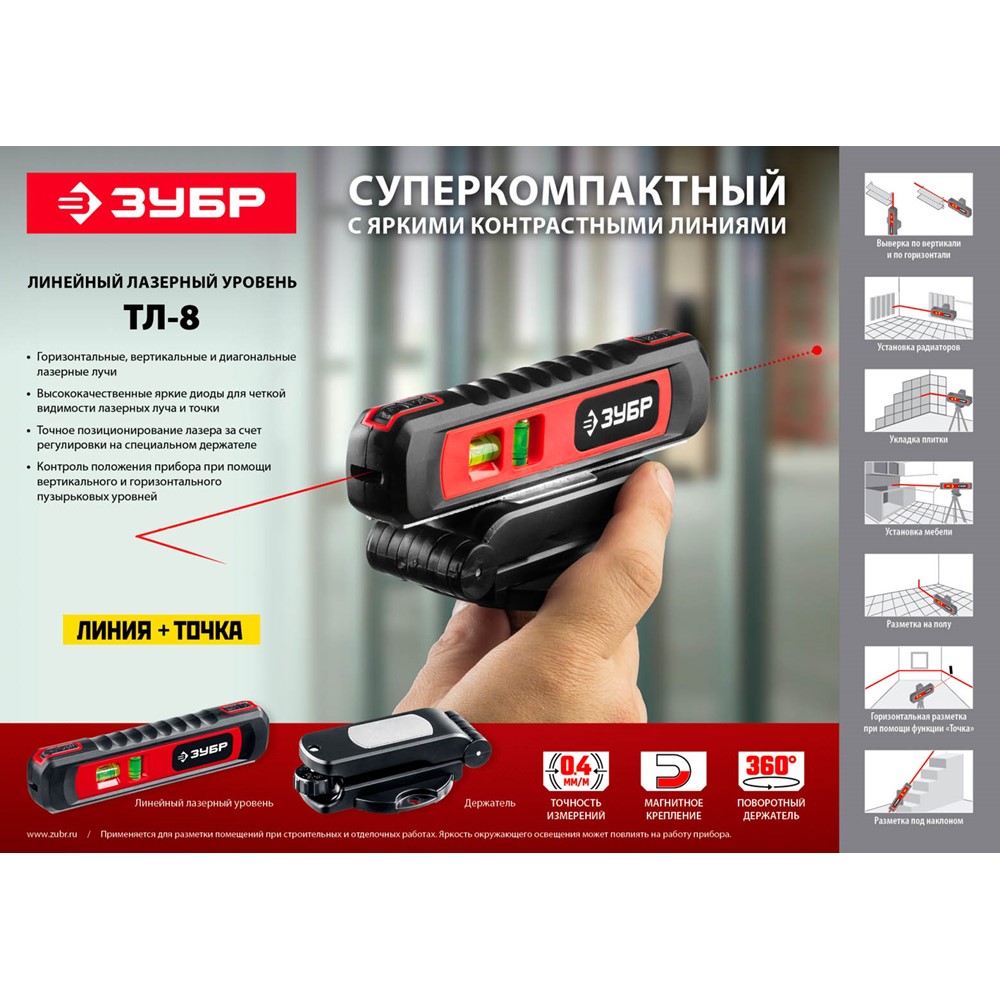 ЗУБР ТОЧКА-ЛИНИЯ уровень линейный лазерный-точка (20м) + линия (5м) , подставка-штатив, точн. +/-0,4 мм/м, 34926