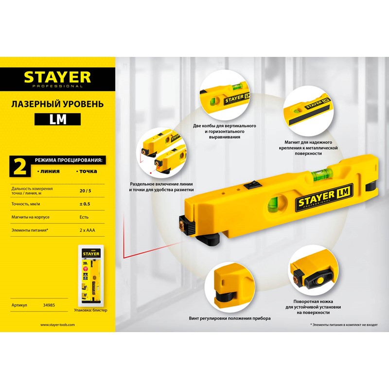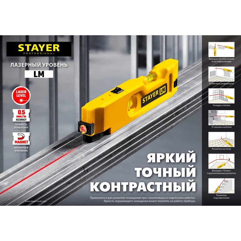 Лазерный линейный уровень STAYER 34985, применяется для отделки помещений, монтажа дверей и окон, вывешивания картин, укладки электропроводки и труб. Компактный размер, максимальная яркость, точность и контрастность.