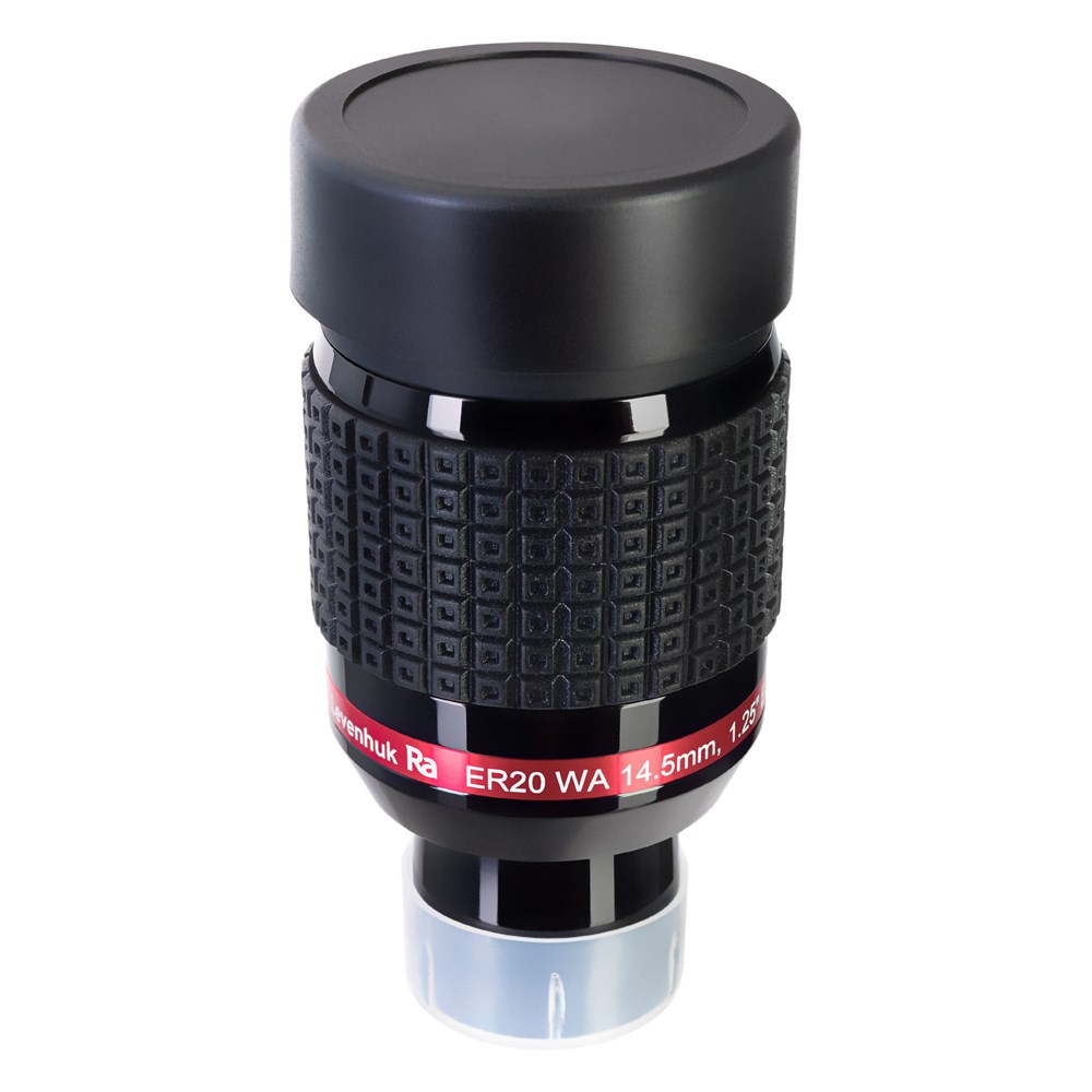 Широкоугольный окуляр Levenhuk Ra ER20 WA 14,5 мм обеспечивает обзор в 68°, что делает его прекрасным выбором для наблюдения протяженных объектов дальнего космоса: звездных скоплений, туманностей, галактик. Это универсальный аксессуар с посадочным диаметром 1,25 дюйма, который создает приятную глазу картинку как на светосильных телескопах для астрофотографии, так и на классических моделях для визуальных наблюдений. Оптические элементы сделаны из стекла и дополнены полным многослойным просветлением. Большинство аберраций, в том числе и хроматизм увеличения, сведены к минимуму и не искажают картинку даже при совместном использовании окуляра с двукратной линзой Барлоу. Оптика создает очень достойное изображение даже на любительских моделях телескопов, а на светосильных апохроматах оно будет близко к идеальному. Стоит отметить большой вынос выходного зрачка и наличие резинового наглазника – это делает длительные наблюдения более удобными и позволяет без усилий наблюдать все поле зрения целиком. Так как наглазник можно складывать и раскладывать, использовать окуляр будет удобно тем, кто обычно ведет наблюдения в очках.