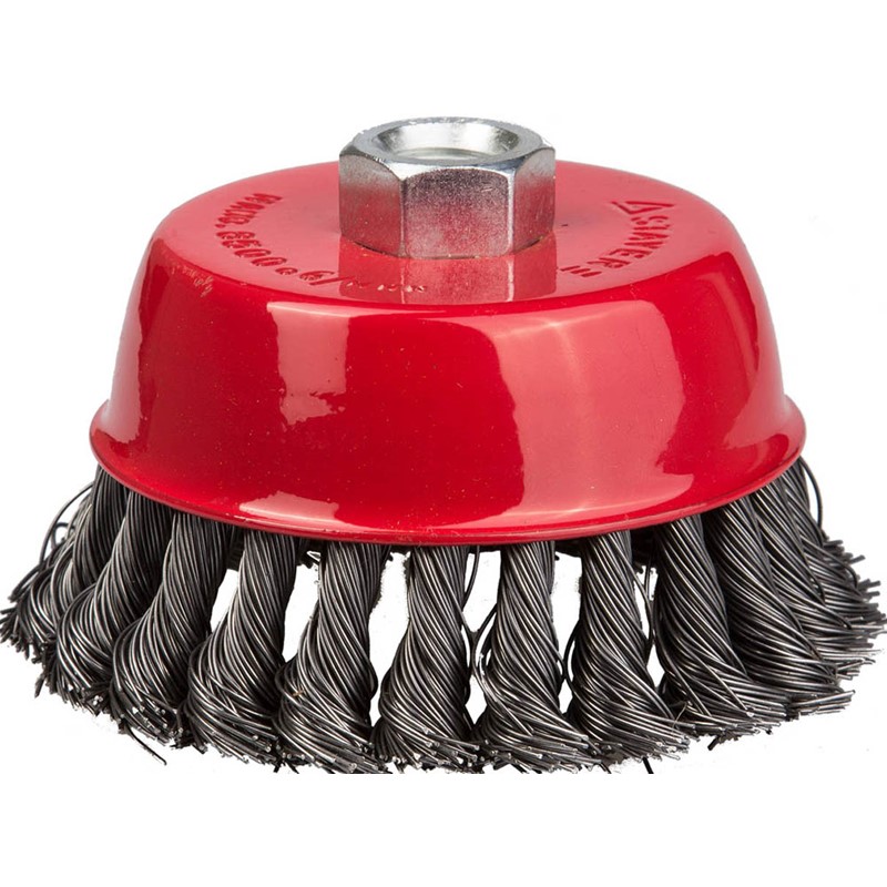 Щетка крацовка чашечная для УШМ STAYER 35128-080_z01, предназначена для зачистки поверхностей от лакокрасочных покрытий, ржавчины, окалины и различных загрязнений с поверхностей изделий из стали и цветных металлов. Щетка изготовлена из латунированной витой проволоки. Латунированное покрытие защищает рабочую часть щетки от коррозии. Витая форма проволоки позволяет обрабатывать поверхности без повреждений. Каждая щетка крацовка STAYER соответствует действующим стандартам качества и обеспечивает безопасную работу в указанном диапазоне оборотов.