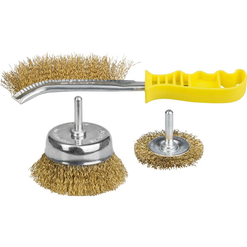 Набор щеток-крацовок для дрели STAYER 35151-H3_z01, для удаления краски, ржавчины, заусенцев, нагара, окалины с поверхностей изделий из стали и цветных металлов. Все изготавливаемые щетки STAYER серии PROFESSIONAL соответствуют действующим стандартам качества и обеспечивают безопасную работу в указанном диапазоне оборотов.