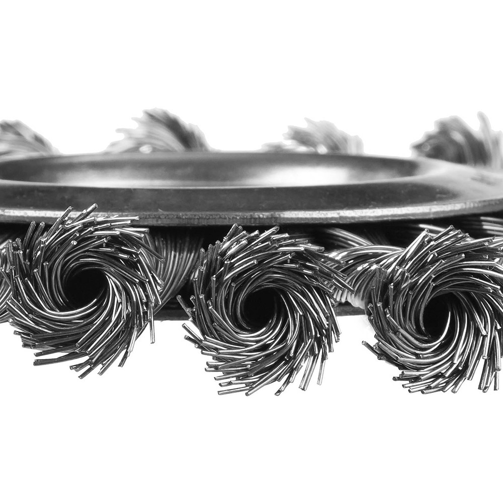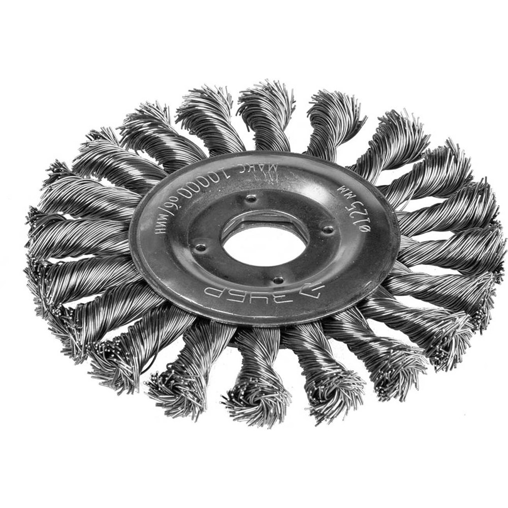 Щетка крацовка дисковая для УШМ ЗУБР 35190-125_z01, предназначена для зачистки поверхностей в труднодоступных местах от лакокрасочных покрытий, ржавчины, окалины, различных загрязнений с применением значительных усилий, а также для зачистки сварных швов. Щетка изготовлена из стальной жгутированной проволоки. Благодаря еще более высокой жесткости сплетенного пучка и увеличенной толщине проволоки щетка обладает повышенным ресурсом.