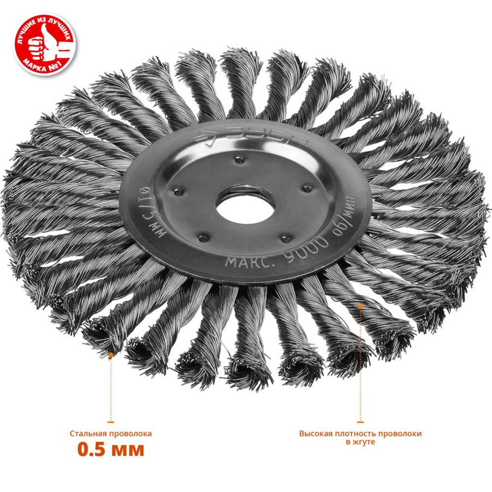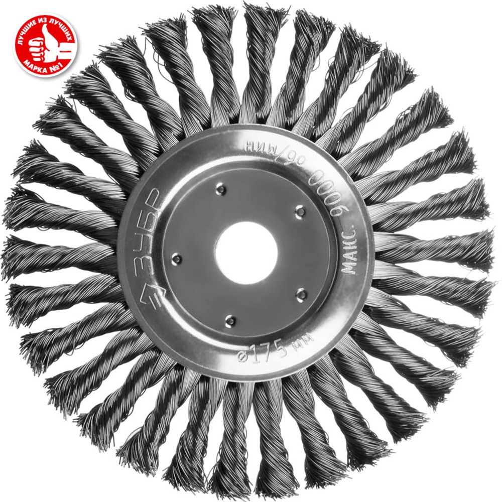 Щетка крацовка дисковая для УШМ ЗУБР 35190-175_z02, предназначена для зачистки поверхностей в труднодоступных местах от лакокрасочных покрытий, ржавчины, окалины, различных загрязнений с применением значительных усилий, а также для зачистки сварных швов. Щетка изготовлена из стальной жгутированной проволоки. Благодаря еще более высокой жесткости сплетенного пучка и увеличенной толщине проволоки щетка обладает повышенным ресурсом.